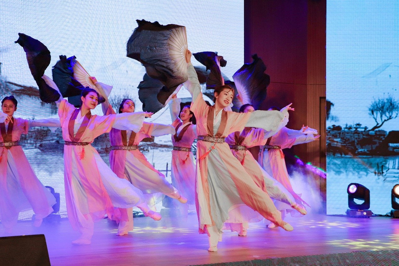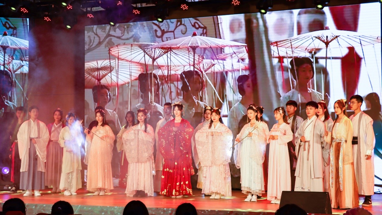 第一篇章“书香会院”,舞蹈《竹简》、民乐合奏《书香一声一世》美轮美奂,给予在场观众一场传统文化盛宴;相声《讲大学》活泼欢快,书名串烧令人拍案叫绝;走秀《梦回汉唐》踏乐而来,衣袂翩翩,亭亭玉立,风姿尽展。