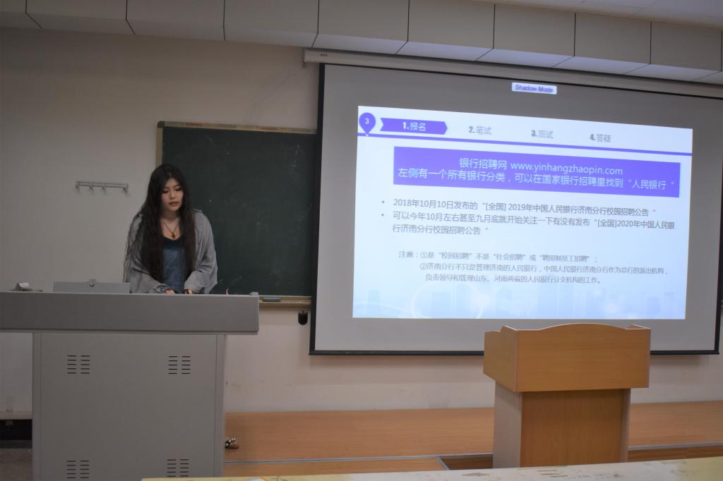 接着,被国家电网淄博供电公司录取的王立强与大家分享了宝贵的企业面试经验。他为大家一一讲解了运营商(移动、联通、电信)、石油(中石油、中石化)、电力(国家电网、发电企业)、烟草(烟草企业、山东中烟)、保险(人寿、人保)的求职过程,并就一些省管企业(山东高速、鲁商集团、山东机场、国泰租赁、鲁华集团)作出推荐。此外,他还介绍了国家电网的报名和考试等细节,强调了注会知识与能力在企业财务中的重要性。