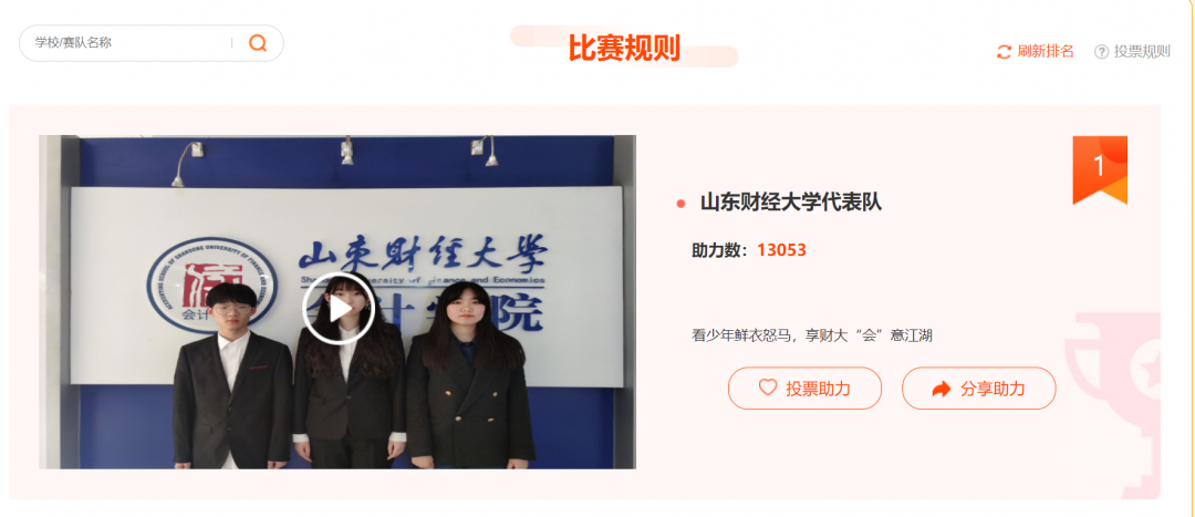因前期我校代表队斩获山东省复赛冠军,我校受邀参加本次国家级大赛,经过单刀赴“会”、“会”意江湖、风云际“会”三个环节的激烈角逐,最终荣获一等奖。其中,注册送彩金代表队在“会”意江湖网络投票环节获得13053点助力值,位列榜首。
