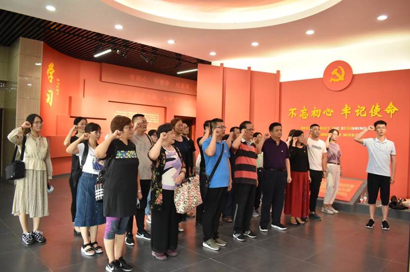 在党性体检馆内,师生党员们重温了党的发展历程和一个个重要时点。历史长河中的一幕幕奋斗情景重现眼前,在党的艰苦奋斗历程和原山林场的艰苦创业历程的双重震撼下,师生党员们内心得到了升华。参观结束后,党员们重温入党誓词,面对鲜红的党旗宣誓。铮铮誓言,展现了同志们更加坚定的理想信念和为祖国人民而艰苦奋斗的信心决心。